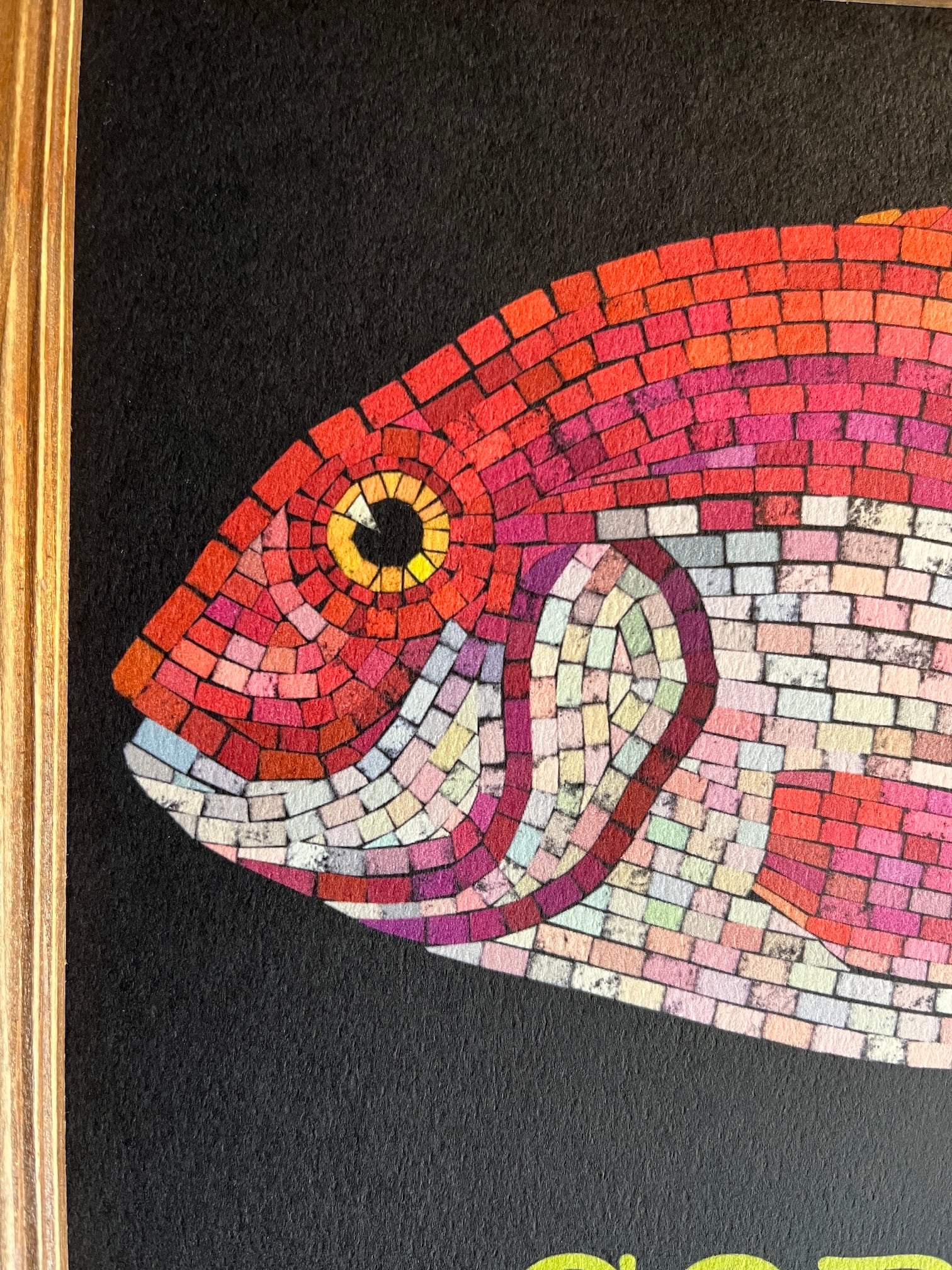 (作品紹介)今回の作品はモザイクタイルをイメージしました。珊瑚やシェルを一つ一つカットした魚をモチーフに特殊ブラシでタイルアートの様に一つ一つ埋め込む様に描きました。どこかネイティブアメリカン【ズニ族】のインレイを思わせる民族作品のようなTAKENOKURASHI特有の味わいある曲線、配色を是非お楽しみ下さい。