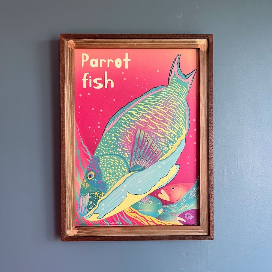 (作品紹介)今回の沖縄島旅からまた一つ作品が生まれました。イラブチャー。沖縄の方言でブダイ類の総称で青い色味が特徴です。珊瑚から違う魚たちが顔を出し色鮮やかな海の中の風景を描きました。