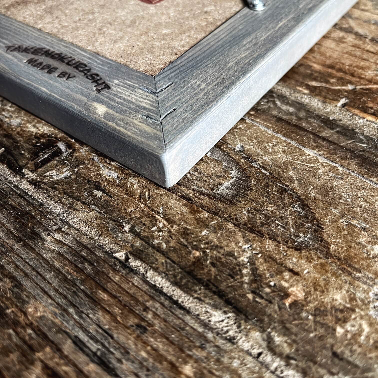 MADE BY TAKENOKURASHIではすべて一点物作品になります。天然木の質感温もりをそのまま生かしカット、研磨、トリマー、材質を作家自ら選び、亜麻仁油ベースで木の呼吸を妨げない安心安全天然自然塗料で仕上げています。製品概念は無く額縁も一つの作品として一つ一つ全ての工程を1人のアート作家が手作業で作り上げています。作業中でのムラ、ダメージ等作品の一環としてご理解ください。ここにしかない二刀流作家のフレームとアートを組み合わせて世界にただ一つだけの作品をあなたへお届けします。