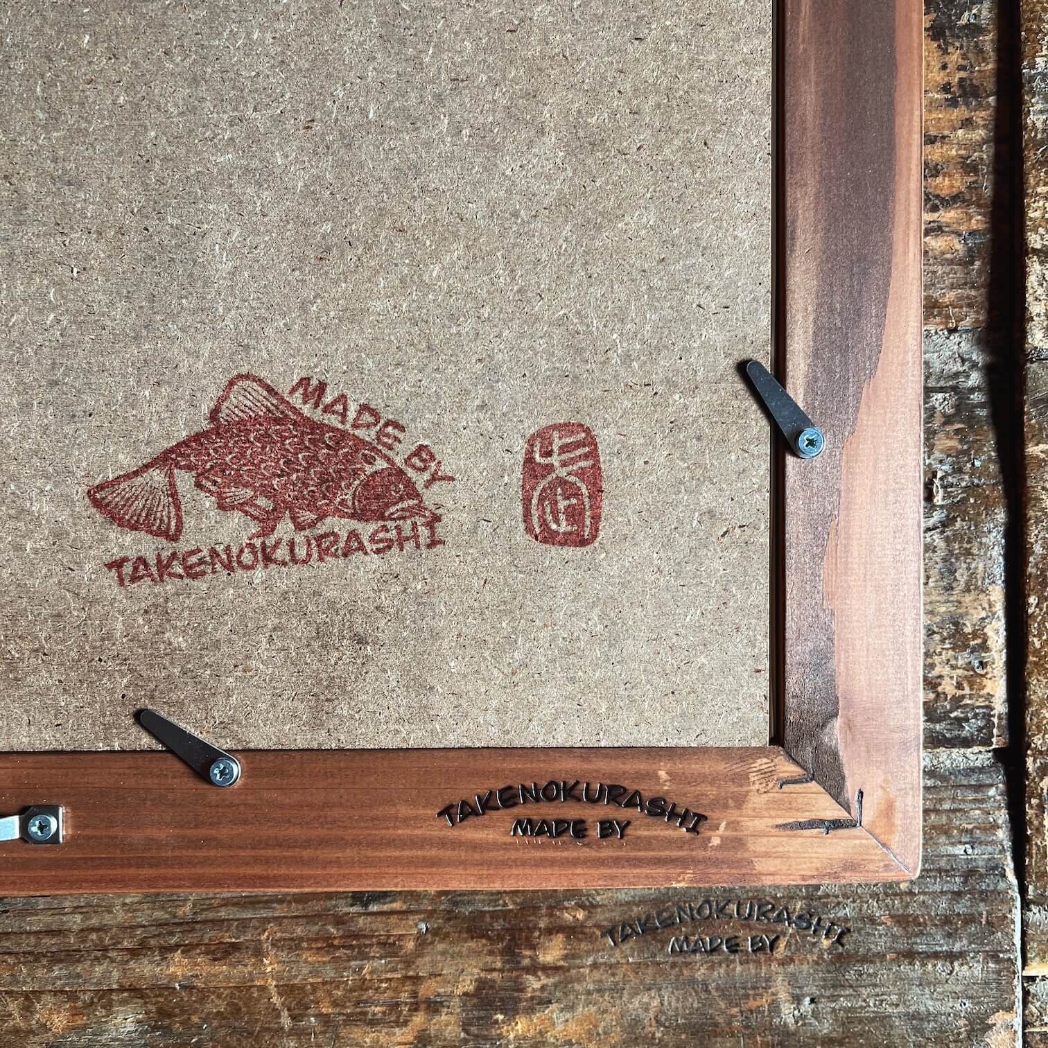 MADE BY TAKENOKURASHIではすべて一点物作品になります。天然木の質感温もりをそのまま生かしカット、研磨、トリマー、材質を作家自ら選び、亜麻仁油ベースで木の呼吸を妨げない安心安全天然自然塗料で仕上げています。製品概念は無く額縁も一つの作品として一つ一つ全ての工程を1人のアート作家が手作業で作り上げています。作業中でのムラ、ダメージ等作品の一環としてご理解ください。ここにしかない二刀流作家のフレームとアートを組み合わせて世界にただ一つだけの作品をあなたへお届けします。