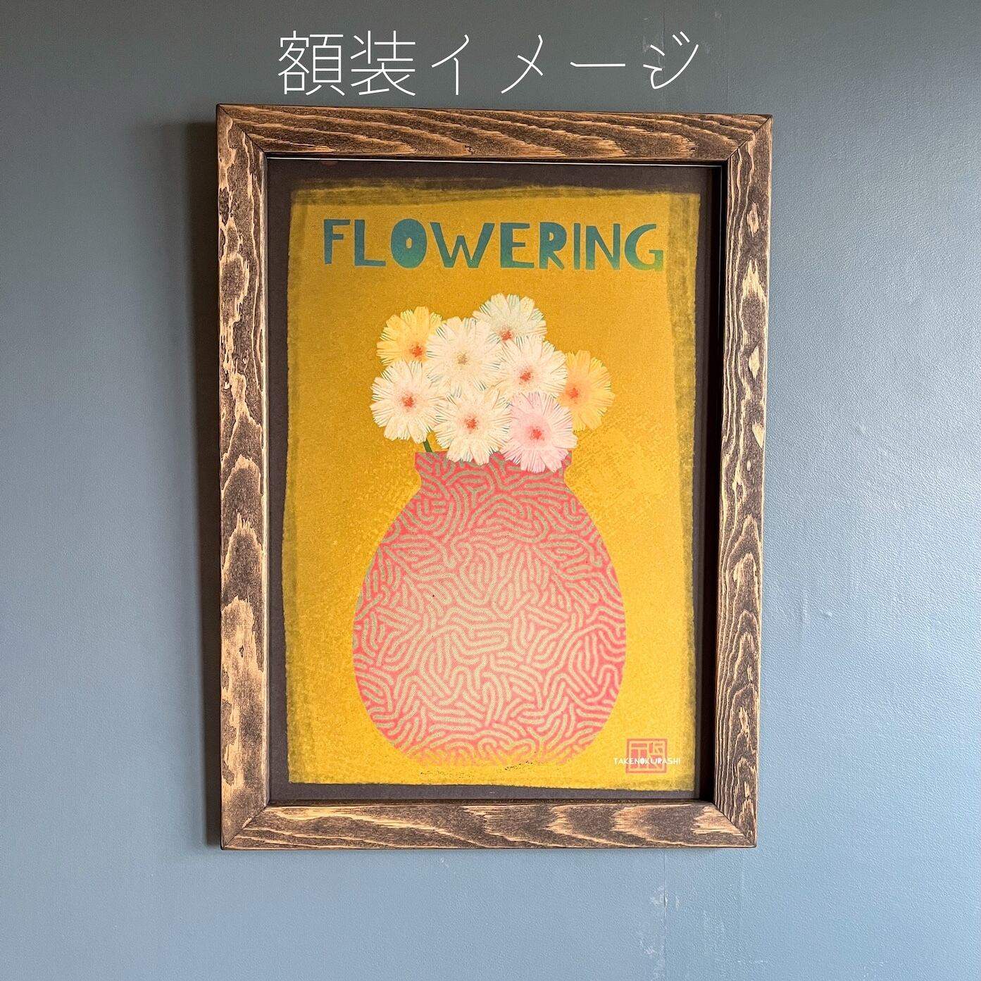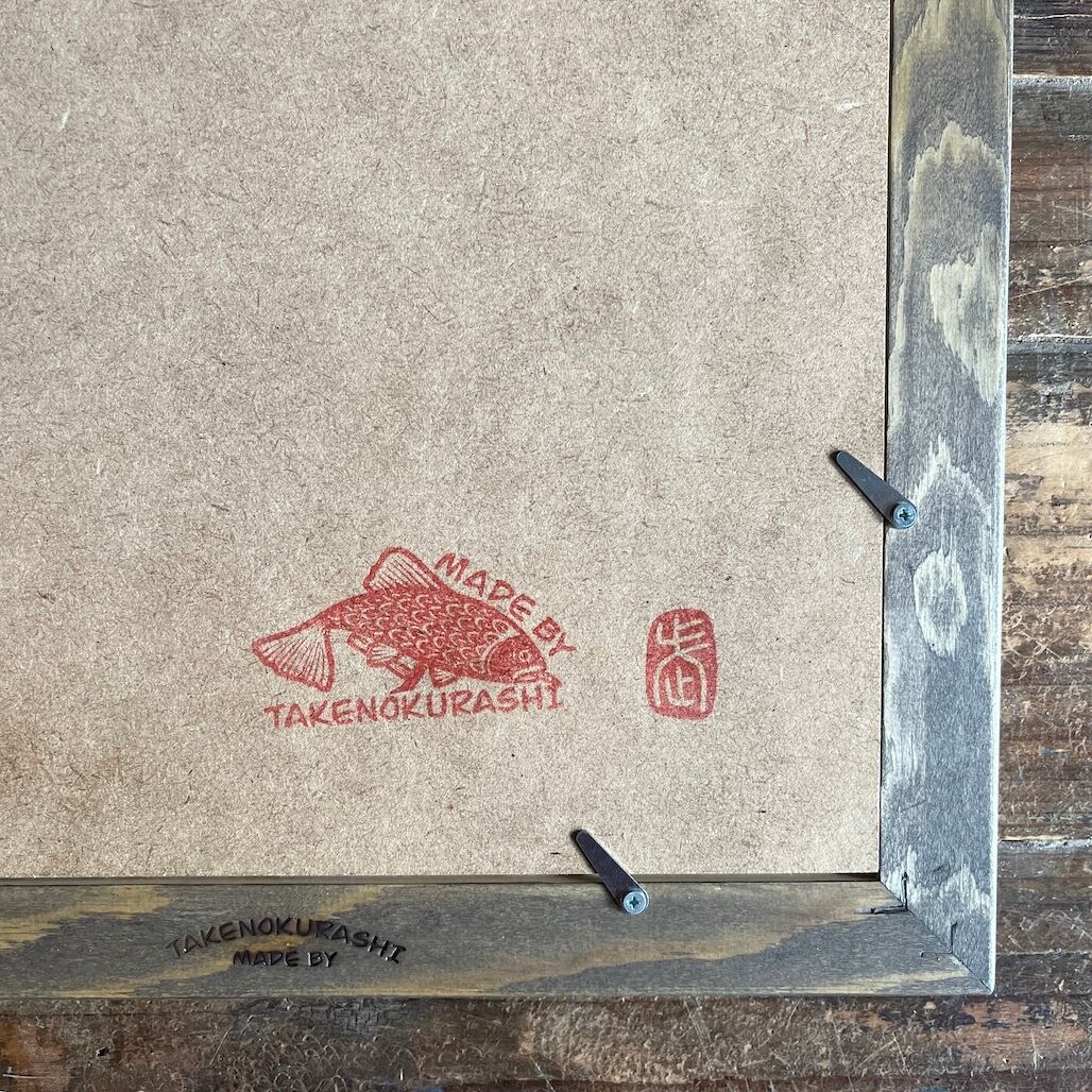 MADE BY TAKENOKURASHIではすべて一点物作品になります。天然木の質感温もりをそのまま生かしカット、研磨、トリマー、材質を作家自ら選び、亜麻仁油ベースで木の呼吸を妨げない安心安全天然自然塗料で仕上げています。製品概念は無く額縁も一つの作品として一つ一つ全ての工程を1人のアート作家が手作業で作り上げています。作業中でのムラ、ダメージ等作品の一環としてご理解ください。ここにしかない二刀流作家のフレームとアートを組み合わせて世界にただ一つだけの作品をあなたへお届けします。