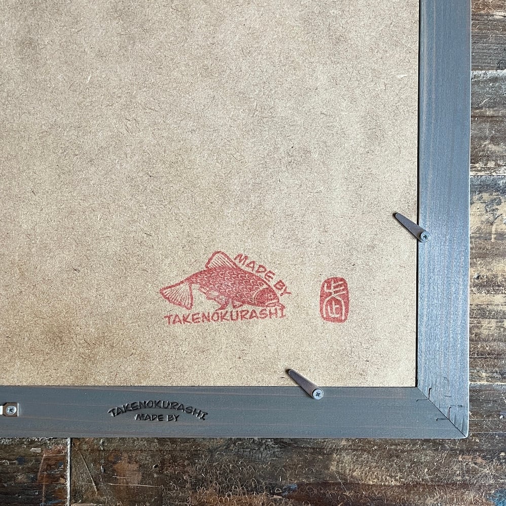 MADE BY TAKENOKURASHIではすべて一点物作品になります。天然木の質感温もりをそのまま生かしカット、研磨、トリマー、材質を作家自ら選び、亜麻仁油ベースで木の呼吸を妨げない安心安全天然自然塗料で仕上げています。製品概念は無く額縁も一つの作品として一つ一つ全ての工程を1人のアート作家が手作業で作り上げています。作業中でのムラ、ダメージ等作品の一環としてご理解ください。ここにしかない二刀流作家のフレームとアートを組み合わせて世界にただ一つだけの作品をあなたへお届けします。
