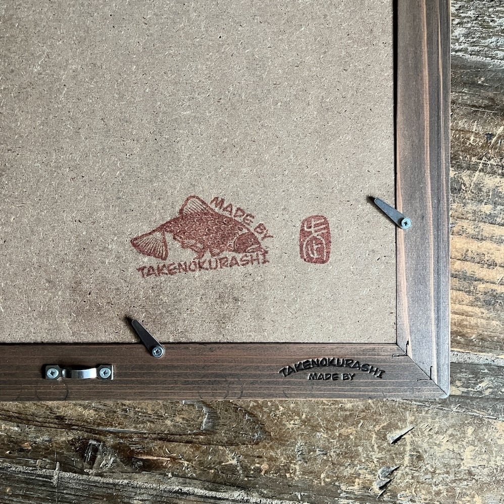 MADE BY TAKENOKURASHIではすべて一点物作品になります。天然木の質感温もりをそのまま生かしカット、研磨、トリマー、材質を作家自ら選び、亜麻仁油ベースで木の呼吸を妨げない安心安全天然自然塗料で仕上げています。製品概念は無く額縁も一つの作品として一つ一つ全ての工程を1人のアート作家が手作業で作り上げています。作業中でのムラ、ダメージ等作品の一環としてご理解ください。ここにしかない二刀流作家のフレームとアートを組み合わせて世界にただ一つだけの作品をあなたへお届けします。