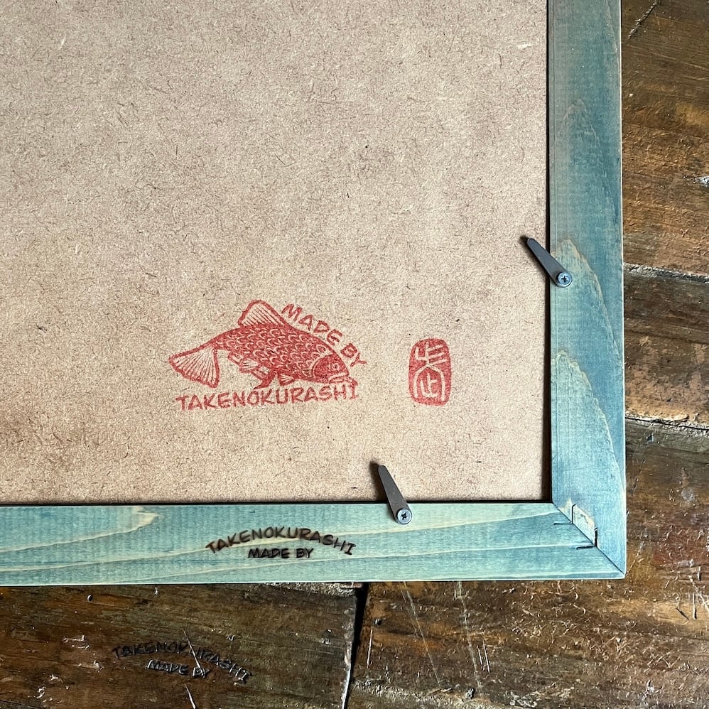 MADE BY TAKENOKURASHIではすべて一点物作品になります。天然木の質感温もりをそのまま生かしカット、研磨、トリマー、材質を作家自ら選び、亜麻仁油ベースで木の呼吸を妨げない安心安全天然自然塗料で仕上げています。製品概念は無く額縁も一つの作品として一つ一つ全ての工程を1人のアート作家が手作業で作り上げています。作業中でのムラ、ダメージ等作品の一環としてご理解ください。ここにしかない二刀流作家のフレームとアートを組み合わせて世界にただ一つだけの作品をあなたへお届けします。