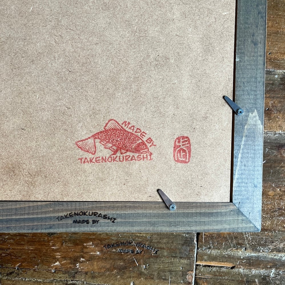 MADE BY TAKENOKURASHIではすべて一点物作品になります。天然木の質感温もりをそのまま生かしカット、研磨、トリマー、材質を作家自ら選び、亜麻仁油ベースで木の呼吸を妨げない安心安全天然自然塗料で仕上げています。製品概念は無く額縁も一つの作品として一つ一つ全ての工程を1人のアート作家が手作業で作り上げています。作業中でのムラ、ダメージ等作品の一環としてご理解ください。ここにしかない二刀流作家のフレームとアートを組み合わせて世界にただ一つだけの作品をあなたへお届けします。