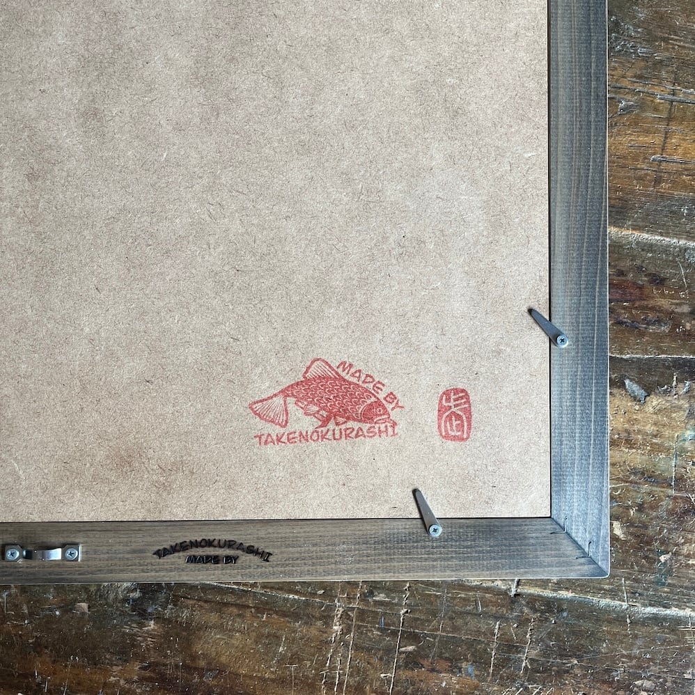 MADE BY TAKENOKURASHIではすべて一点物作品になります。天然木の質感温もりをそのまま生かしカット、研磨、トリマー、材質を作家自ら選び、亜麻仁油ベースで木の呼吸を妨げない安心安全天然自然塗料で仕上げています。製品概念は無く額縁も一つの作品として一つ一つ全ての工程を1人のアート作家が手作業で作り上げています。作業中でのムラ、ダメージ等作品の一環としてご理解ください。ここにしかない二刀流作家のフレームとアートを組み合わせて世界にただ一つだけの作品をあなたへお届けします。