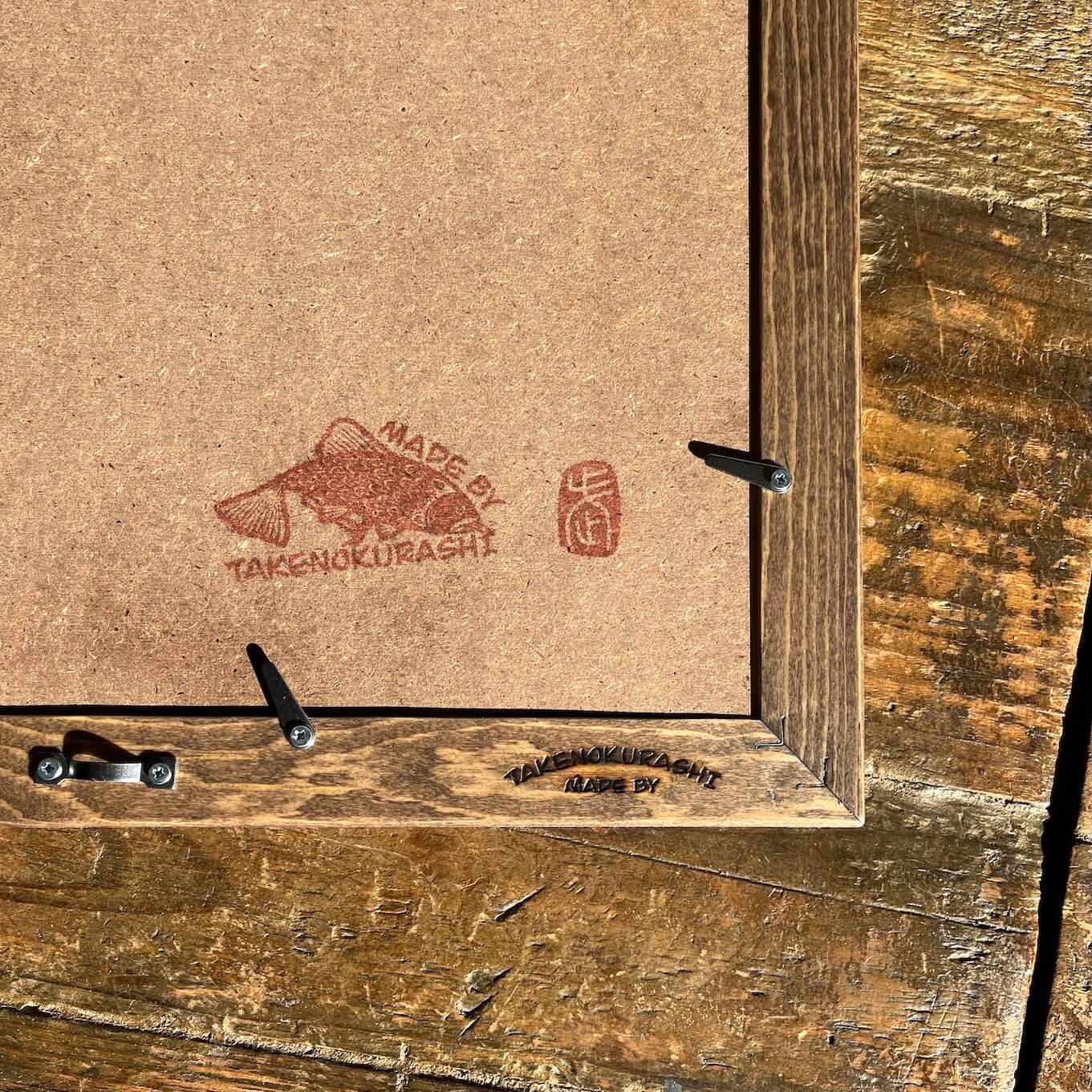 MADE BY TAKENOKURASHIではすべて一点物作品になります。天然木の質感温もりをそのまま生かしカット、研磨、トリマー、材質を作家自ら選び、亜麻仁油ベースで木の呼吸を妨げない安心安全天然自然塗料で仕上げています。製品概念は無く額縁も一つの作品として一つ一つ全ての工程を1人のアート作家が手作業で作り上げています。作業中でのムラ、ダメージ等作品の一環としてご理解ください。ここにしかない二刀流作家のフレームとアートを組み合わせて世界にただ一つだけの作品をあなたへお届けします。