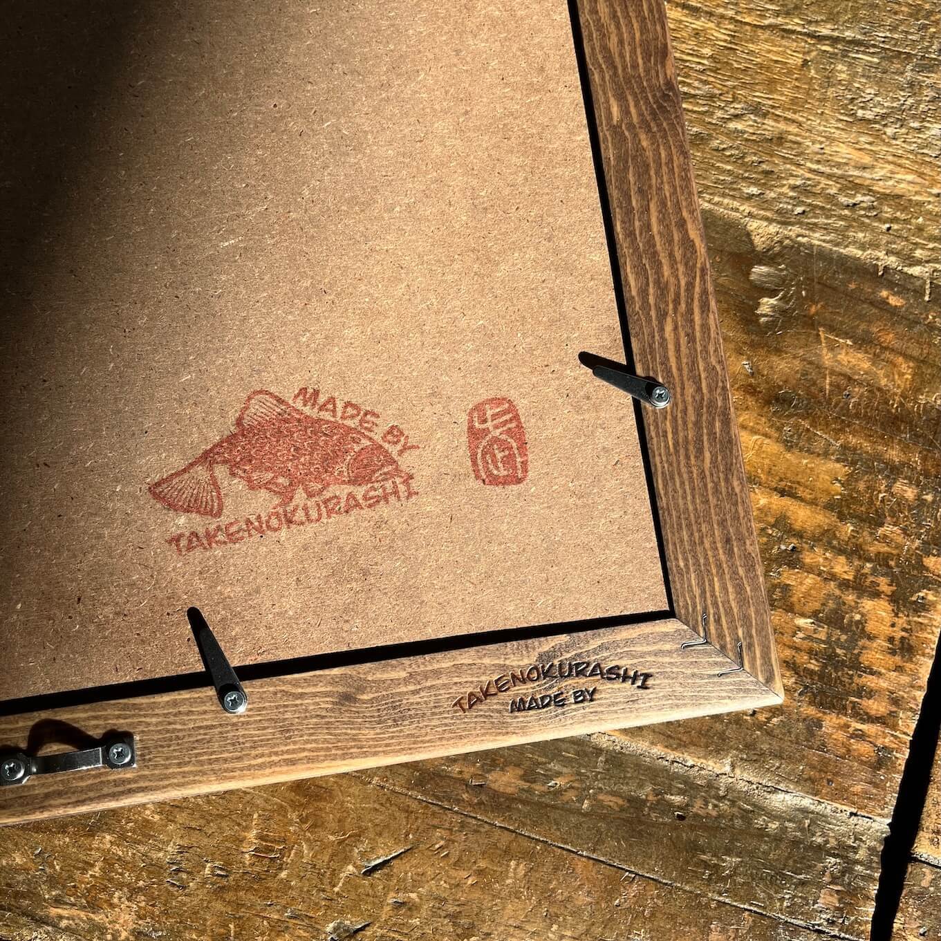 MADE BY TAKENOKURASHIではすべて一点物作品になります。天然木の質感温もりをそのまま生かしカット、研磨、トリマー、材質を作家自ら選び、亜麻仁油ベースで木の呼吸を妨げない安心安全天然自然塗料で仕上げています。製品概念は無く額縁も一つの作品として一つ一つ全ての工程を1人のアート作家が手作業で作り上げています。作業中でのムラ、ダメージ等作品の一環としてご理解ください。ここにしかない二刀流作家のフレームとアートを組み合わせて世界にただ一つだけの作品をあなたへお届けします。
