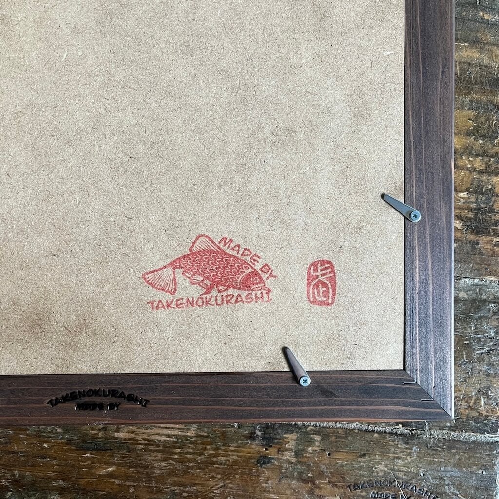 MADE BY TAKENOKURASHIではすべて一点物作品になります。天然木の質感温もりをそのまま生かしカット、研磨、トリマー、材質を作家自ら選び、亜麻仁油ベースで木の呼吸を妨げない安心安全天然自然塗料で仕上げています。製品概念は無く額縁も一つの作品として一つ一つ全ての工程を1人のアート作家が手作業で作り上げています。作業中でのムラ、ダメージ等作品の一環としてご理解ください。ここにしかない二刀流作家のフレームとアートを組み合わせて世界にただ一つだけの作品をあなたへお届けします。