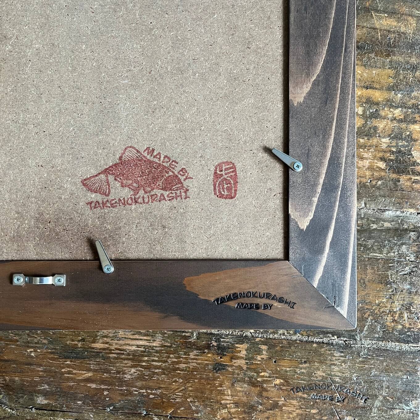MADE BY TAKENOKURASHIではすべて一点物作品になります。天然木の質感温もりをそのまま生かしカット、研磨、トリマー、材質を作家自ら選び、亜麻仁油ベースで木の呼吸を妨げない安心安全天然自然塗料で仕上げています。製品概念は無く額縁も一つの作品として一つ一つ全ての工程を1人のアート作家が手作業で作り上げています。作業中でのムラ、ダメージ等作品の一環としてご理解ください。ここにしかない二刀流作家のフレームとアートを組み合わせて世界にただ一つだけの作品をあなたへお届けします。