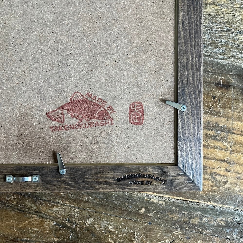 MADE BY TAKENOKURASHIではすべて一点物作品になります。天然木の質感温もりをそのまま生かしカット、研磨、トリマー、材質を作家自ら選び、亜麻仁油ベースで木の呼吸を妨げない安心安全天然自然塗料で仕上げています。製品概念は無く額縁も一つの作品として一つ一つ全ての工程を1人のアート作家が手作業で作り上げています。作業中でのムラ、ダメージ等作品の一環としてご理解ください。ここにしかない二刀流作家のフレームとアートを組み合わせて世界にただ一つだけの作品をあなたへお届けします。