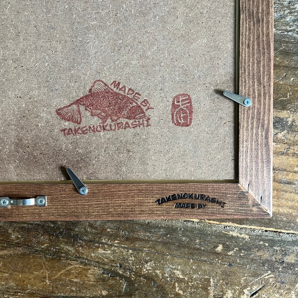 MADE BY TAKENOKURASHIではすべて一点物作品になります。天然木の質感温もりをそのまま生かしカット、研磨、トリマー、材質を作家自ら選び、亜麻仁油ベースで木の呼吸を妨げない安心安全天然自然塗料で仕上げています。製品概念は無く額縁も一つの作品として一つ一つ全ての工程を1人のアート作家が手作業で作り上げています。作業中でのムラ、ダメージ等作品の一環としてご理解ください。ここにしかない二刀流作家のフレームとアートを組み合わせて世界にただ一つだけの作品をあなたへお届けします。