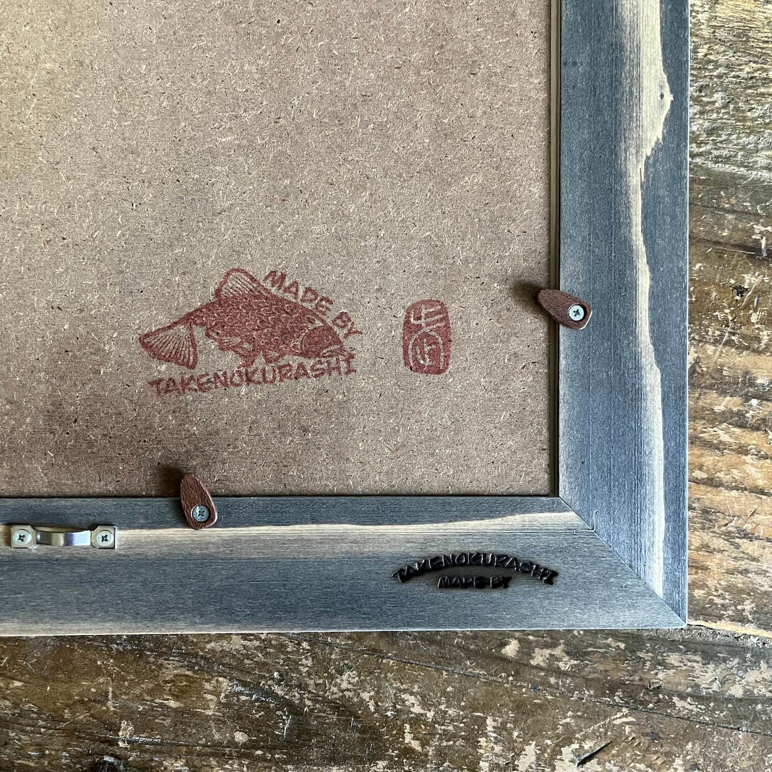 MADE BY TAKENOKURASHIではすべて一点物作品になります。天然木の質感温もりをそのまま生かしカット、研磨、トリマー、材質を作家自ら選び、亜麻仁油ベースで木の呼吸を妨げない安心安全天然自然塗料で仕上げています。製品概念は無く額縁も一つの作品として一つ一つ全ての工程を1人のアート作家が手作業で作り上げています。作業中でのムラ、ダメージ等作品の一環としてご理解ください。ここにしかない二刀流作家のフレームとアートを組み合わせて世界にただ一つだけの作品をあなたへお届けします。