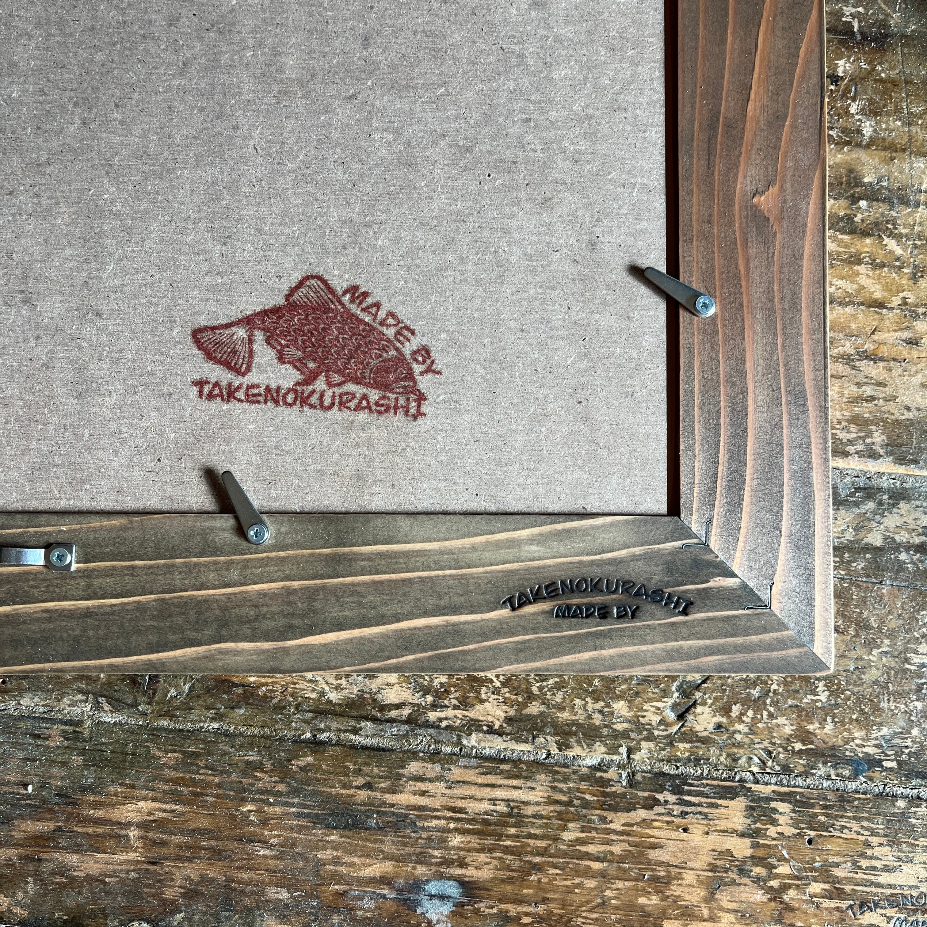 MADE BY TAKENOKURASHIではすべて一点物作品になります。天然木の質感温もりをそのまま生かしカット、研磨、トリマー、材質を作家自ら選び、亜麻仁油ベースで木の呼吸を妨げない安心安全天然自然塗料で仕上げています。製品概念は無く額縁も一つの作品として一つ一つ全ての工程を1人のアート作家が手作業で作り上げています。作業中でのムラ、ダメージ等作品の一環としてご理解ください。ここにしかない二刀流作家のフレームとアートを組み合わせて世界にただ一つだけの作品をあなたへお届けします。