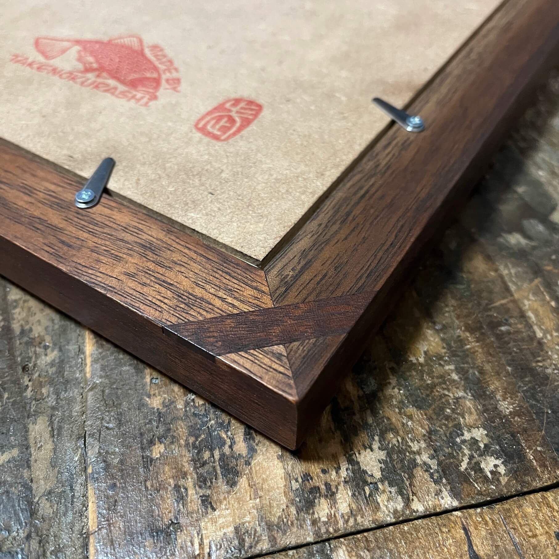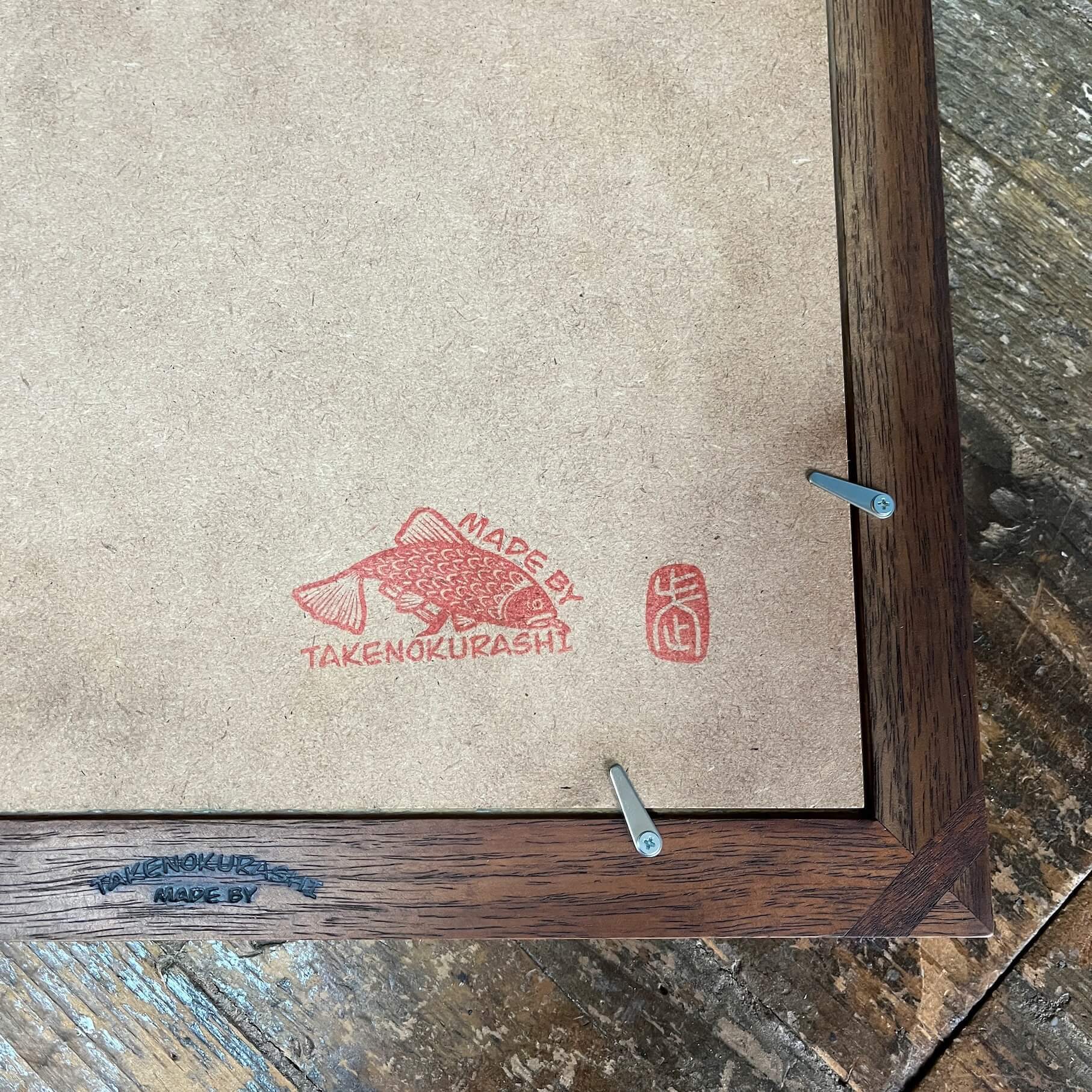 MADE BY TAKENOKURASHIではすべて一点物作品になります。天然木の質感温もりをそのまま生かしカット、研磨、トリマー、材質を作家自ら選び、亜麻仁油ベースで木の呼吸を妨げない安心安全天然自然塗料で仕上げています。製品概念は無く額縁も一つの作品として一つ一つ全ての工程を1人のアート作家が手作業で作り上げています。作業中でのムラ、ダメージ等作品の一環としてご理解ください。ここにしかない二刀流作家のフレームとアートを組み合わせて世界にただ一つだけの作品をあなたへお届けします。